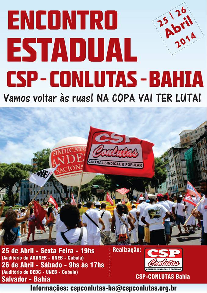 Acontece na próxima sexta (25) e sábado (26), na Uneb, em Salvador, o Seminário Estadual da CSP Conlutas Bahia. O evento é uma oportunidade de aproximar entidades e movimentos sociais às ações da Central na Bahia. Estão previstas na programação duas mesas de discussões com os temas _A conjuntura Nacional e Estadual e os Desafios para a CSP-Conlutas Bahia_ e A organização da CSP-Conlutas Bahia frente às necessidades da reorganização. Ainda no sábado (26), às 14h, a Coordenação Estadual da CSP-Conlutas Bahia se reúne e discute os encaminhamentos do Seminário. Também será avaliada a prestação de contas do ano anterior.