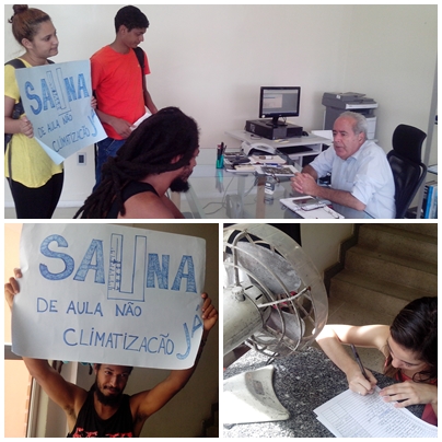 Nós, estudantes da UESC, alocados no Pavilhão de Ciências Exatas e Tecnológicas, realizamos na tarde de ontem(24), uma mobilização, reivindicando as condições das salas de aulas. As atuais condições das salas de aula beiram a insalubridade, já que os aparelhos ar-condicionado não funcionam em sua totalidade desde o inicio das atividades, há um ano e meio. Cerca de 200 assinaturas dos discentes foram colhidas e encamihadas à reitoria.