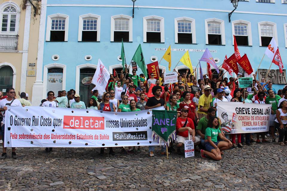 O Movimento Docente (MD) das Universidades Estaduais Baianas (UEBA) e diversos outros movimentos sociais que constroem o “Espaço de Unidade de Ação” realizaram um forte ato no 2 de Julho, em Salvador. Os manifestantes denunciaram os governos Temer, Rui Costa e ACM Neto, que atacam os direitos dos trabalhadores e os serviços públicos para atender os interesses dos patrões. Com panfletos e faixas, cartazes e palavras de ordem a mobilização convidou o funcionalismo baiano à construção da Greve Geral, aprovada durante plenária da FETRAB, no dia 30 de junho.