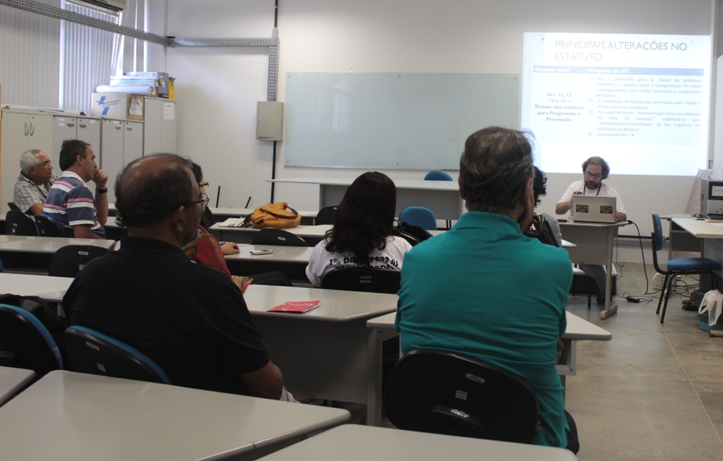 informações sobre o desenvolvimento das discussões do GT carreira do Fórum das ADs. Blume apresentou os diversos ataques do governo ao Estatuto de Magistério Superior, como a demora dos processos de progressão do docente. Segundo o Estatuto, o processo se encerraria na universidade, sem dependência de dotação orçamentária para mudança de nível.