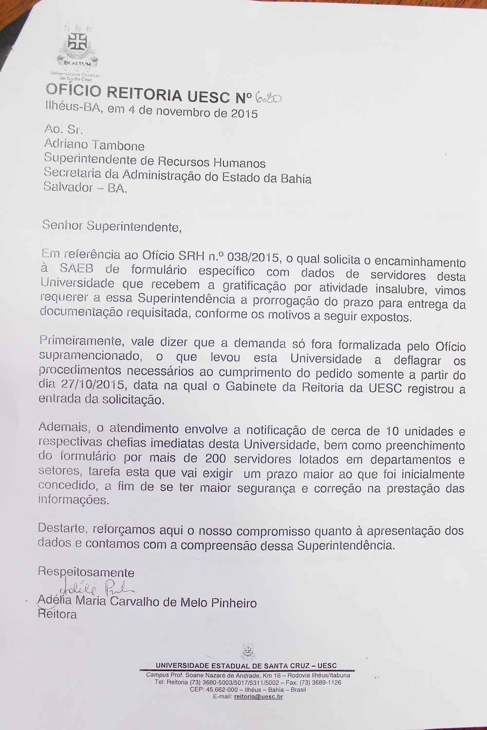 Atendendo à solicitação da ADUSC, a administração da UESC encaminhou a SAEB o alargamento do prazo para organização dos documentos solicitados. No documento, a reitoria afirma que o atendimento da solicitação envolve o preenchimento do formulário por mais de 200 servidores de diversos setores da instituição (veja aqui).