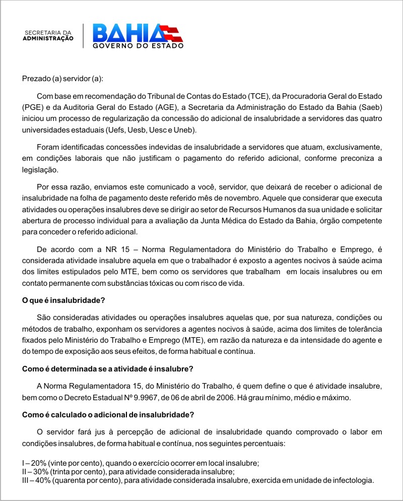 Os professores das UEBA foram notificados, na tarde de quarta-feira (25), do corte no adicional de insalubridade na