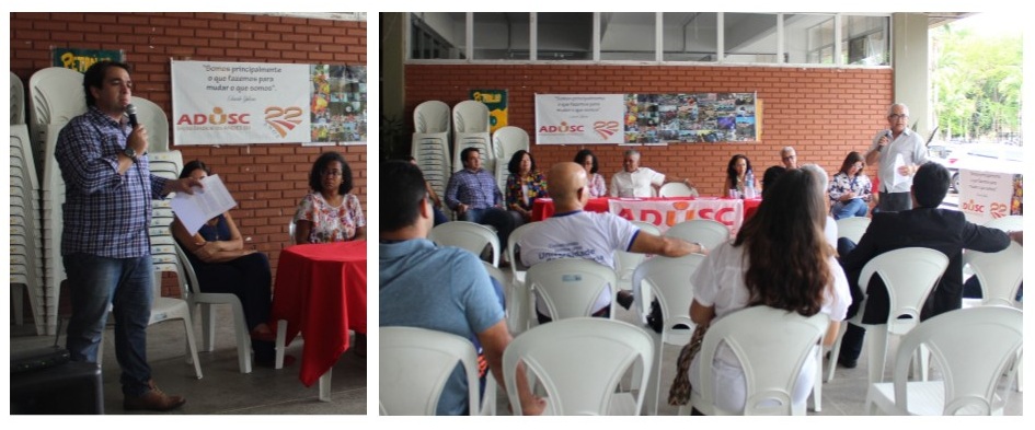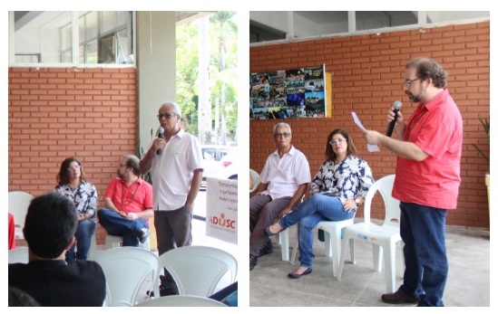 Em assembleia realizada nesta quinta-feira (12), tomou posse a nova diretoria da ADUSC para gestão 2015-2017. Na oportunidade, foi feito o balanço pelo então presidente Emerson Lucena sobre a gestão que se encerra, que, em seguida, passou o cargo para o docente José Luiz de França. Discursos emocionados trataram da trajetória do sindicato, dos desafios enfrentados pela gestão 2013-2015, encorajando os que agora assumem a liderança da categoria docente na UESC.