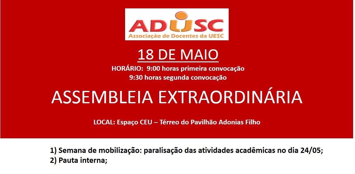No uso de suas atribuições, que lhe confere o Art. 22 do Regimento Geral, a diretoria da ADUSC/Seção Sindical do ANDES/SN, convoca a todos os associados para Assembleia Extraordinária a realizar-se no dia 18.05.2016 (quarta-feira), às 09:00h em primeira convocação e às 9:30:00h em segunda, no CEU, no Térreo do Pavilhão Adonias Filho, com a seguinte pauta: