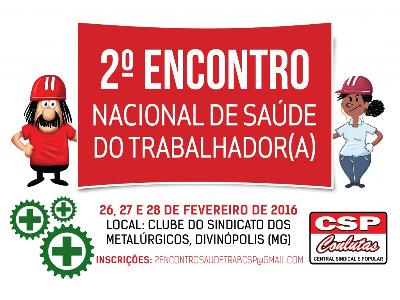 A CSP-Conlutas, entidade à qual o ANDES-SN é filiado, realizará entre os dias 26 e 28 de fevereiro, o 2º Encontro Nacional de Saúde dos Trabalhadores na cidade de Divinópolis (MG). O encontro, que contará com representantes sindicais e especialistas em saúde do trabalhador, irá debater e votar um programa de lutas voltado ao combate do aumento da exploração e do ritmo de trabalho no Brasil e no mundo. Os interessados em participar do encontro têm até o dia 15 de fevereiro para se inscreverem.