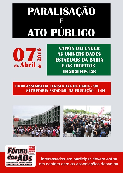 O Fórum das associações docentes das universidades estaduais da Bahia, ADUSC, ADUSB, ADUNEB e ADUFS, convocam toda a comunidade acadêmica para participar de ato público em defesa da educação no dia 7 de abril, em Salvador. O ato é motivado pelos recentes ataques aos direitos trabalhistas dos professores e servidores estaduais, reivindica melhores condições de estudo e trabalho nas universidades estaduais e uma política de assistência ao estudantil eficiente.