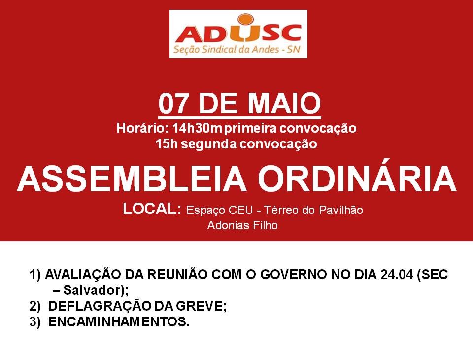 ADUSC comunica que no dia 07 de maio haverá duas assembleias. Uma extraordinária, que terá como um dos pontos de pauta, a deflagração da greve. A segunda, é ordinária, com o ponto de pauta sobre o 2º Congresso da CSP-Conlutas.