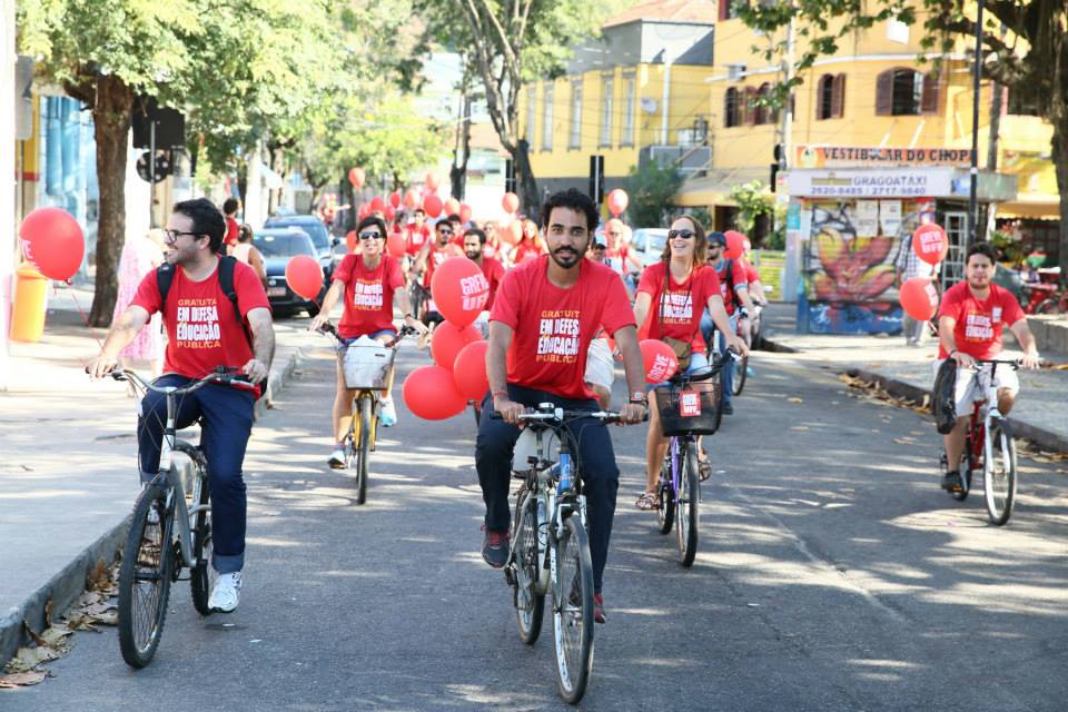 Na Universidade Federal Fluminense (UFF), dezenas de professores e estudantes realizaram uma bicicletada na quarta-feira (5). Eles saíram da Praça da Cantareira, em Niterói (RJ), em direção à reitoria. Os manifestantes denunciaram a expansão precarizada, que amplia o número de vagas, mas não oferece condições de trabalho e de estudo e as medidas de ajuste fiscal do governo, que resultaram em cortes nos recursos da Educação. O protesto criticou ainda a falta de diálogo do reitor da UFF, Sidney Mello, que após quase 70 dias de greve, não recebeu o movimento paredista, e também não respondeu as pautas do movimento.