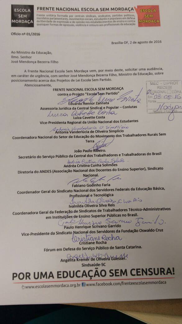 Representantes da Frente Nacional Escola sem Mordaça, da qual o ANDES-SN faz parte, protocolaram nessa quarta-feira (3) uma carta no Ministério da Educação e outras três cartas no Congresso Nacional exigindo a realização de audiência pública para discutir os projetos de lei com base no programa Escola Sem Partido, que pretendem impor uma série de proibições à liberdade e a autonomia pedagógica dos professores e das escolas. A ação compõe a agenda construída na última reunião da Frente no dia 19 de julho, em Brasília (DF).