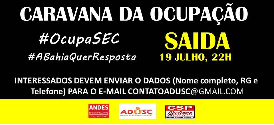 Diante do cenário de greve há mais de dois meses, o descaso de governo e a ocupação da SEC, o Comando de Greve dos professores das Ueba chama toda a categoria e o Movimento Estudantil a participar e reforçar a ocupação da Secretaria Estadual da Educação. As negociações estão em um momento importante e todos são fundamentais neste momento de luta. Para que os interessados possam vir integrar o movimento, as Associações Docentes disponibilizarão toda a infraestrutura necessária. A hora é agora! Venha somar e fortalecer ainda mais a luta em defesa da universidade pública, gratuita e de qualidade socialmente referenciada. mostrar a força das Universidades Estaduais da Bahia.