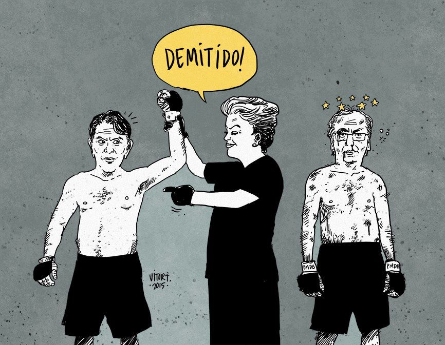 3) O Planalto demite o ministro da educação,Cid Gomes. O ministro da educação na “Pátria Educadora”, muito criticado pelos movimentos sociais da educação por sua gestão no Ceará, esticou a corda. Declarou que a Câmara dos Deputados possui “_uns 400 deputados, 300 deputados achacadores (…) Eles querem é que o governo esteja frágil porque é a forma de eles achacarem mais, tomarem mais, tirarem mais dele, aprovarem as emendas impositivas_“. Sinceridade demais não é virtude na política palaciana do legislativo. E nesse momento de ânimos aflorados, o PMDB não aceita transigências em seu poder. Quer colocar o governo no seu “devido” lugar, acuado, sozinho, pedindo esmola. Por isso, Cunha chamou Cid para se desculpar no Congresso e Cid reiterou suas acusações, afirmando que se a carapuça serviu a culpa não é dele e que essa base aliada deveria “_largar o osso_” e ir de vez para a oposição. A situação se tornou insustentável e Cunha deu nova demonstração da força do PMDB. Este grande partido da pequena política, mais temido que amado, esperneou e Dilma prontamente atendeu. Cid foi demitido imediatamente. Reforça-se o isolamento do governo e precipita-se uma reforma ministerial (após apenas três meses de governo). O próximo passo do governo, ao que tudo indica, é ceder mais espaço ao PMDB, alterando a composição dos ministérios para agradá-lo e tentar continuar em Brasília pelo menos até o fim do mandato.