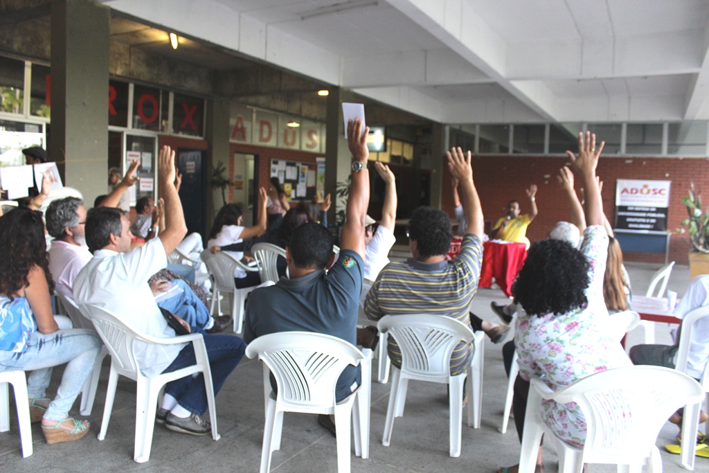 Os docentes da UESC aprovaram em assembleia realizada nesta quarta-feira (10⁄09) a adesão a Semana de Mobilização e Lutas indicada pelo Fórum das Doze, com greve de advertência por três dias (17 a 19) e ato na Assembleia Legislativa da Bahia (ALBA). O posicionamento unanime na assembleia reforçou a disposição da categoria em responder a políticas de estrangulamento para as Universidades Estaduais Baianas (UEBA) imposta pelo governo e reforçada com a redução de 7,3 milhões na rubrica de investimento e custeio, prevista para 2015. Os problemas internos, como os recentes incêndios, e a falta de transparência da administração da UESC também foram pautados.
