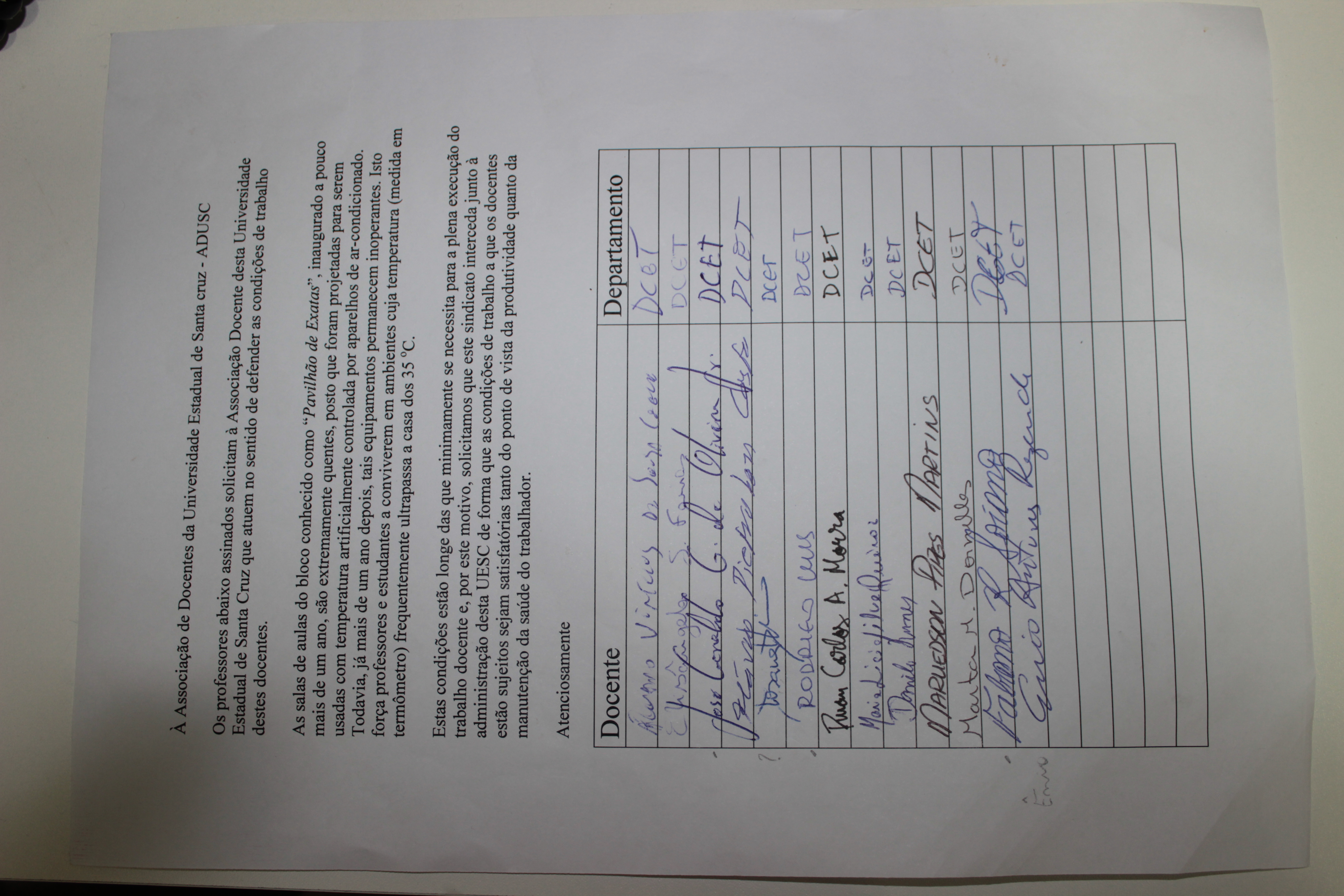 Nestas condições, docentes do DCET entregaram, nesta quinta-feira (10), um abaixo-assinado solicitando que a diretoria da ADUSC faça uma intervenção junto à administração da UESC em prol das condições de trabalho da categoria (veja aqui). O documento será encaminhado em anexo a um Ofício solicitando mais uma vez da reitoria informações referente aos impactos da escassez orçamentária na estrutura da universidade e na rotina acadêmica como um todo.