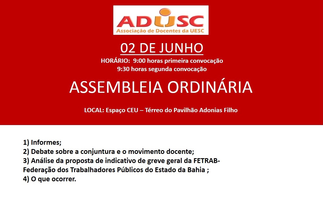 Nesse sentido, é que foi encaminhada a realização da plenária do dia 7 de Junho, para discutir a construção de uma Greve Geral. O tema será pautado na próxima assembleia da ADUSC que acontecerá na quinta-feira (02), a partir das 9:30 horas, no CEU. (confira aqui convocatória).