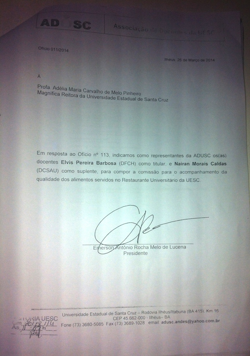 Em nota publicada no site da UESC a reitoria também se compromete com as mudanças estruturais, e atribui a uma comissão mista (com representação estudantil, de docentes e de servidores técnicos), a discussão sobre a qualidade da alimentação servida no restaurante universitário. Os representantes docentes foram indicados pela diretoria da ADUSC no dia 26 de março (conforme documento anexo).